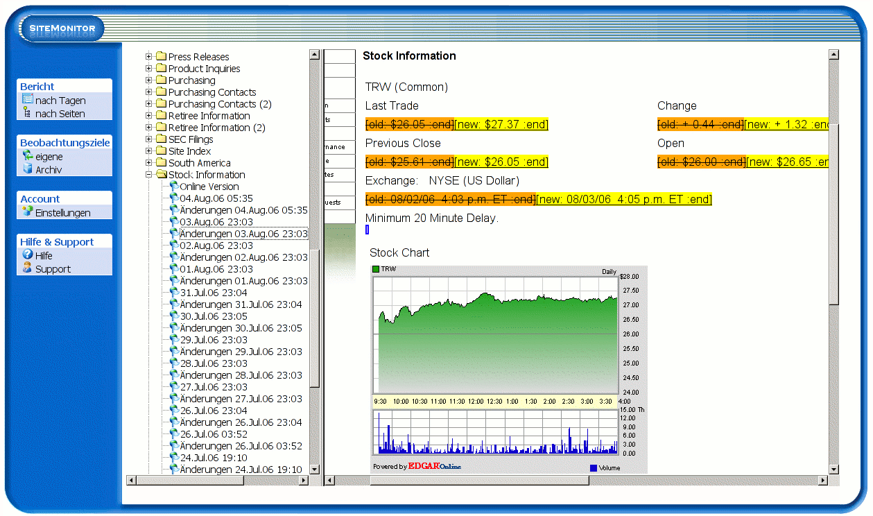 Mit SiteMonitor können Sie sogar die Zeit zurückdrehen. Im Beispiel sehen Sie die "stock information"-Seite eines beobachteten Unternehmens. Sie wollen wissen welche Kursveränderungen es an einem bestimmten Tag in der Vergangenheit gab? Oder wie eine Produktseite vor 3 Monaten aussah? Kein Problem!